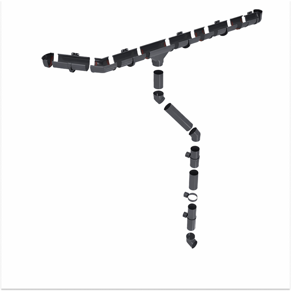 Комплект водосточной системы Grand Line Design 135 из ПВХ для отвода воды с кровли. Размер: 135×90×6000 мм. Цвет: графит RAL 7024.