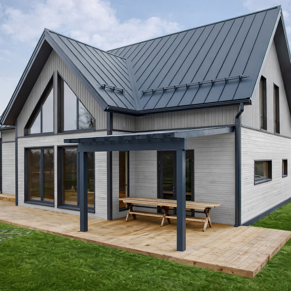 Панели изготовлены из оцинкованной стали с защитным полимерным покрытием, которое обеспечивает устойчивость к коррозии, ультрафиолетовому излучению и атмосферным воздействиям. Благодаря этому материал сохраняет цвет и прочность на протяжении длительного времени эксплуатации.