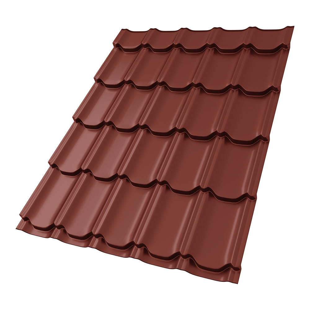 RAL 8004 — «Терракота». Тёплый оранжево‑коричневый цвет, классическое кровельное решение, которое хорошо смотрится с бежевой и кремовой штукатуркой и фасадами в средиземноморском стиле.