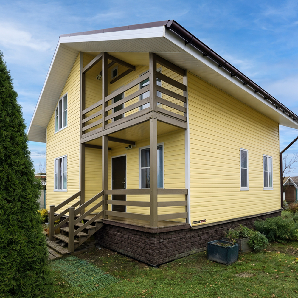 Сайдинг производится из оцинкованной стали с защитным полимерным покрытием, которое обеспечивает устойчивость к коррозии, ультрафиолетовому излучению и атмосферным воздействиям. Благодаря этому панели сохраняют цвет и внешний вид на протяжении длительного времени эксплуатации.